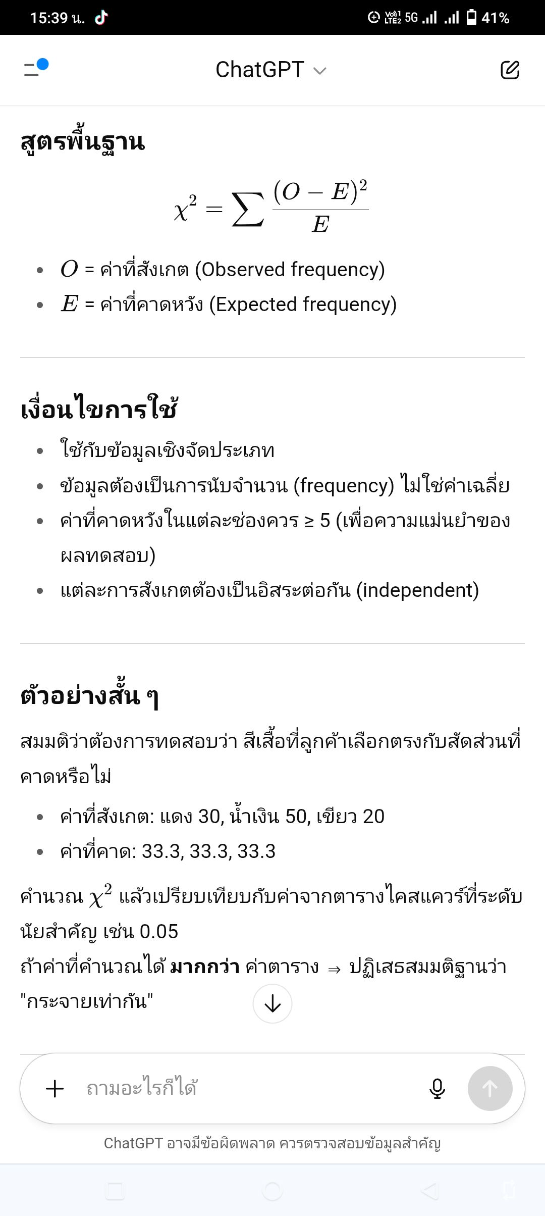 ไคสแควร์ คืออะไร chisquare Chi-square test ((การทดสอบไคสแควร์)) เป็นการทดสอบทางสถิติที่ใช้ตรวจสอบว่า ค่าที่สังเกตได้ ((Observed \_ Frequencies)) แตกต่างจาก ค่าที่คาดหวัง ((Expected \_ Frequencies)) อย่างมีนัยสำคัญทางสถิติหรือไม่ โดยหลัก ๆ ใช้กับข้อมูลที่อยู่ใน รูปแบบเชิงจัดประเภท ((Categorical \_ Data))